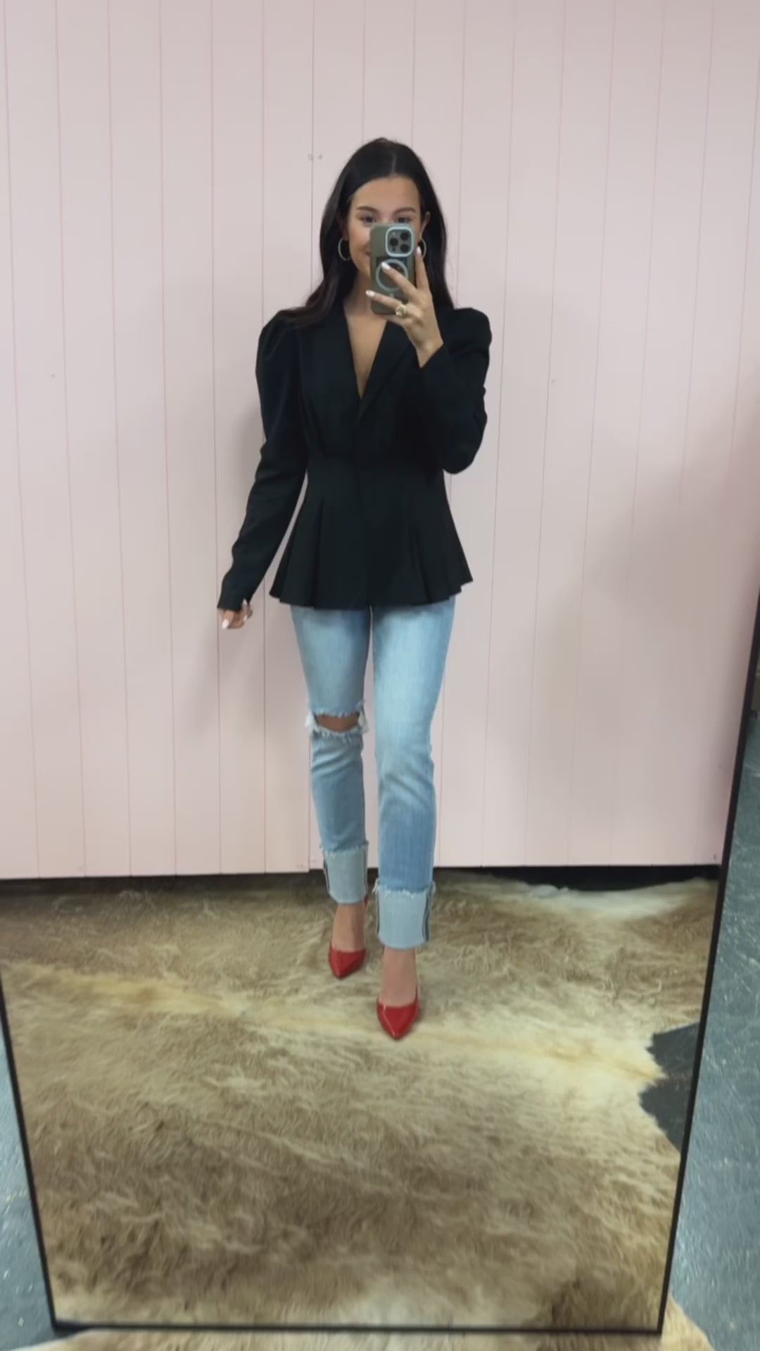 Puff shoulder, button front, pleats detail, tailored blazer.
